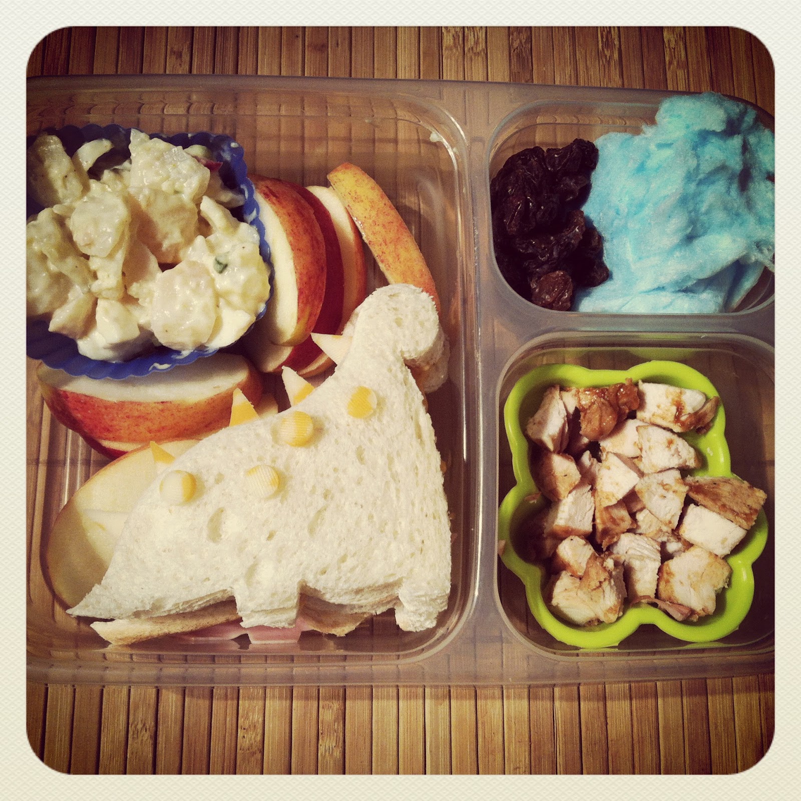 | In this bento: Dino sammie, apple slices, cubed chicken, rasins, cotton candy, potato salad |